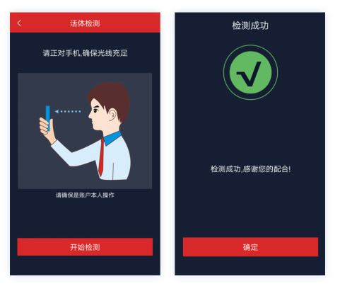 根据页面提示,正对手机屏幕,确保光线充足,点击开始检测,根据语音和页面指引做出相应动作,完成活体人像识别,系统会根据人像和动作进行身份认证。