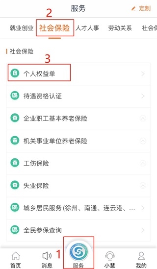 二、登录后,点击“服务”选项,选择“社会保险”,点击“个人权益单”